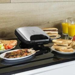 Superficie de plancha grill para un tostado uniforme que no comprime el sándwich.